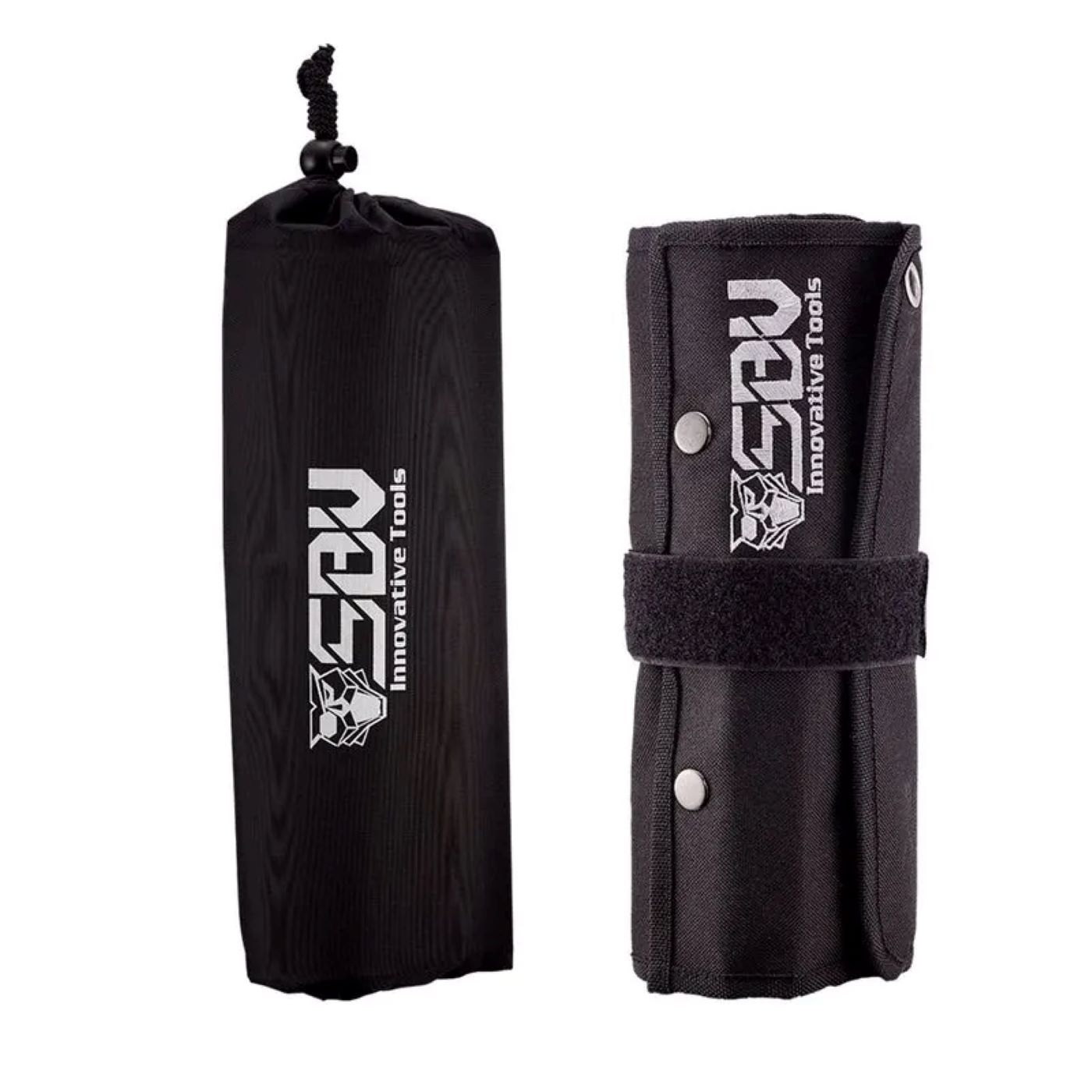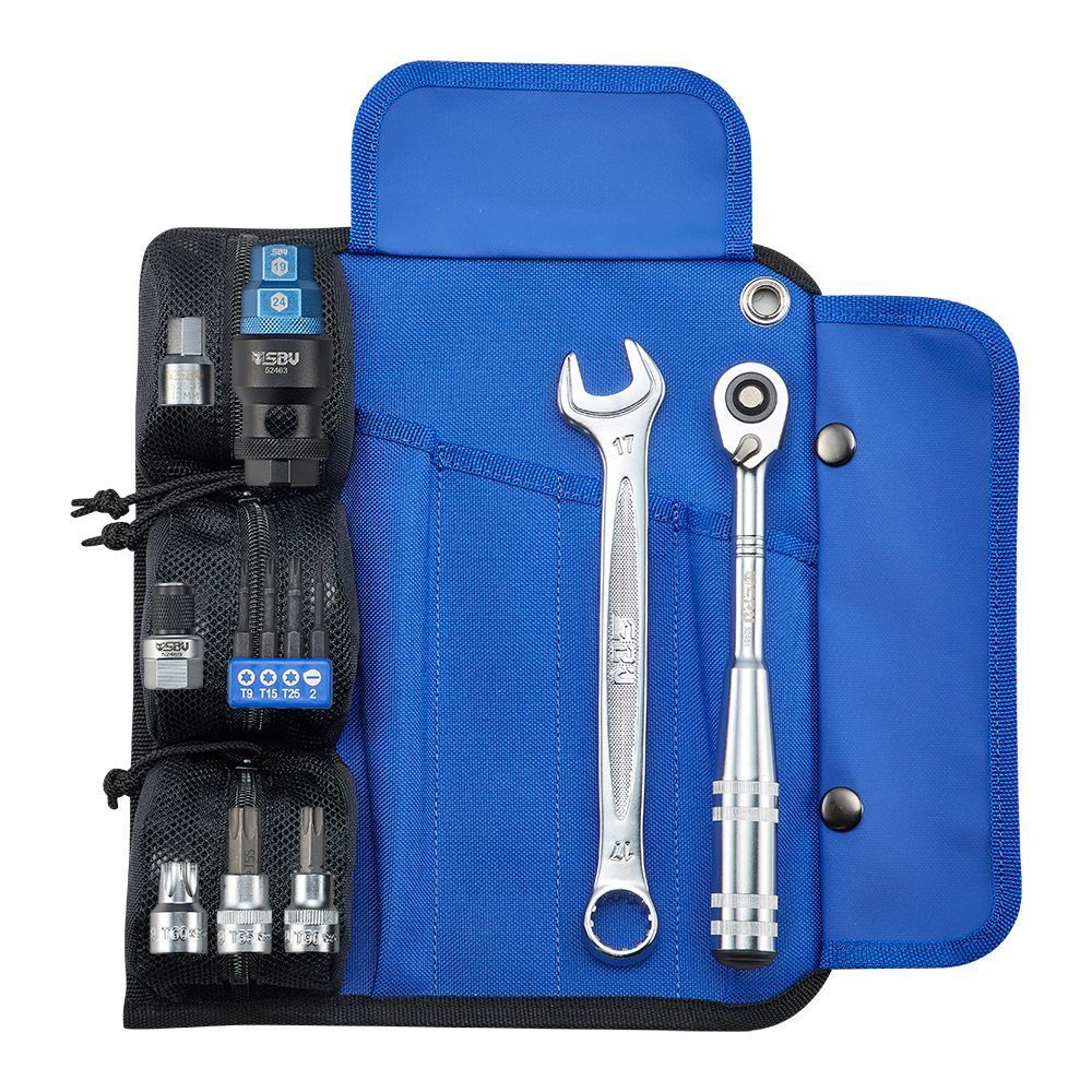 Sculele sunt fabricate din materiale de înaltă calitate (biți S2 cu protecție anticorozivă, chei și capete Cr-V cromate satinat) și sunt organizate într-o husă tip rulou, compactă și rezistentă, ușor de transportat pe motocicletă.